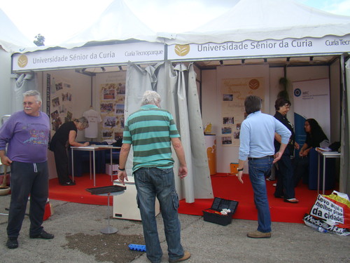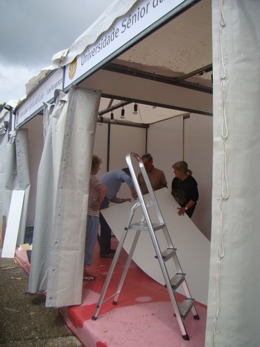 Tudo fazia prever um dia cansativo e com chuva a querer ameaçar... Todavia, a equipa de "engenheiros" foi competentíssima, e volvidos um par de horas, o stand da USC era já uma realidade.